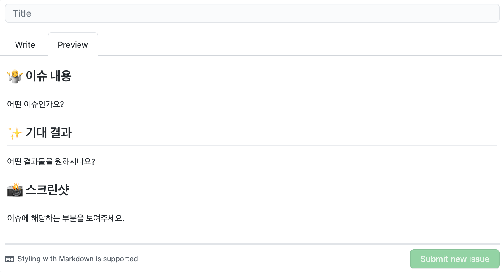 그리고 프로젝트의 issue에 들어가서 New Issue를 클릭하면 작성한 템플릿이 적용되는 것을 확인할 수 있다.