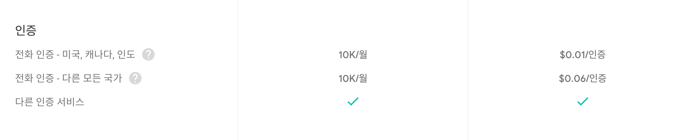 인증에 대한 요금은 거의 무료이다. 전화 인증의 경우만 요금을 받고 있는 것을 볼 수 있다.