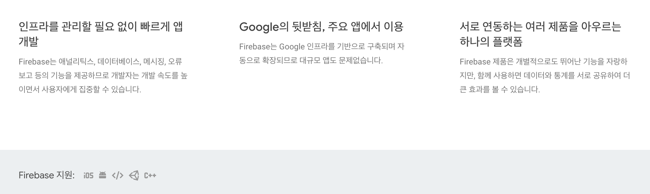 Firebase는 원래 데이터 베이스였다. 하지만 구글이 인수를 하고 시간이 지나, 지금의 Firebase는 데이터 베이스 뿐만 아니라 다양한 백엔드 기능을 제공해주는 플랫폼으로 바뀌었다. Firebase를 이용하면 사용자 인증, 데이터 베이스, 스토리지 등과 같은 백엔드 단에서 필요한 기능을 구축하는데에 쓰이는 시간을 아낄 수 있고 오직 프론트엔드에서의 비지니스 로직만을 구현하는데에 집중할 수 있다.