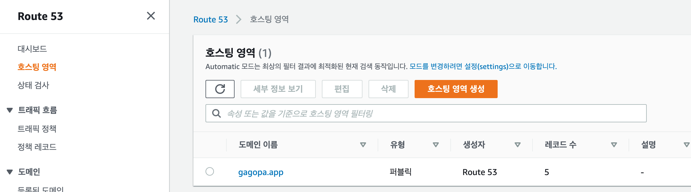 Route53 콘솔로 이동한 후, 왼쪽 메뉴에서 호스팅 영역을 클릭하고 호스팅 영역 생성을 클릭한다.