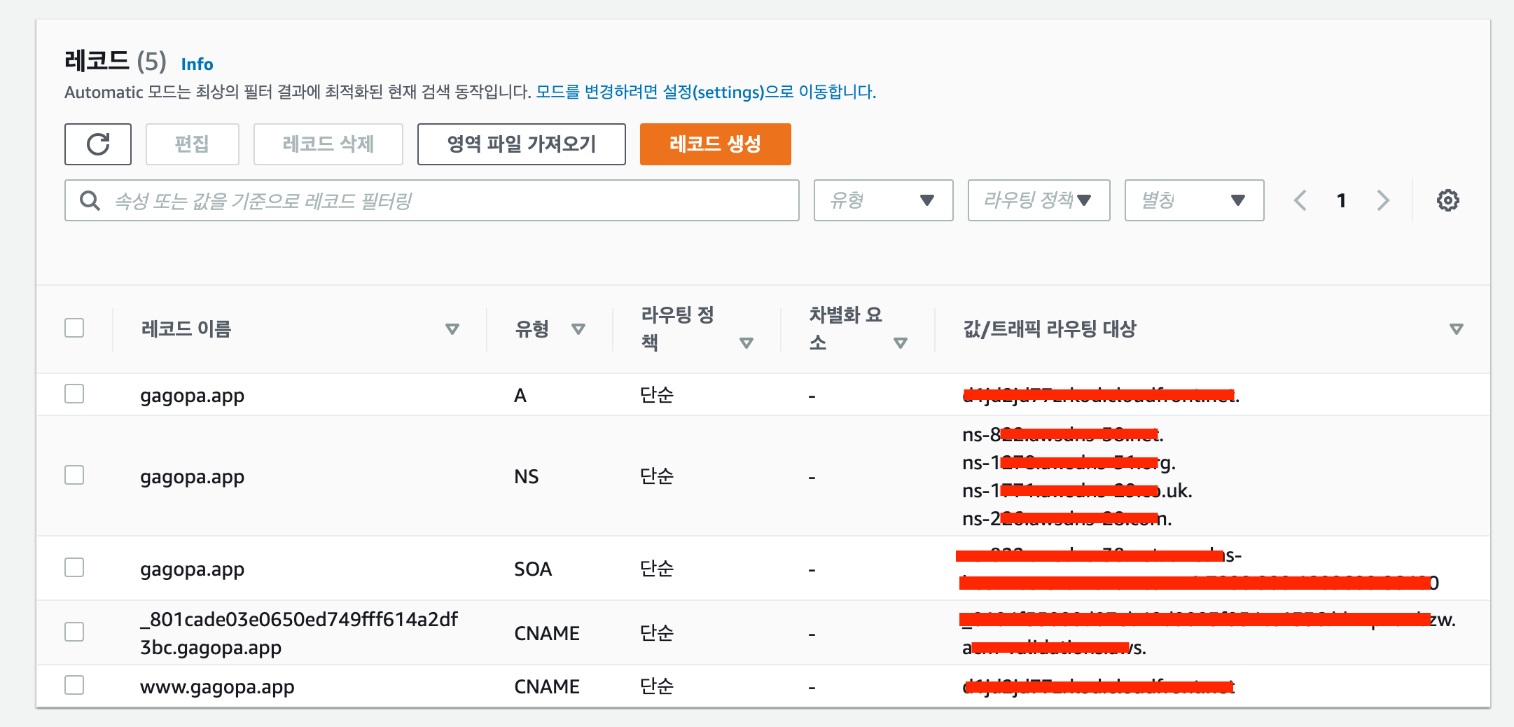 도메인 이름에 구매한 도메인을 입력해주고 도메인을 생성한다. 그리고 작성한 도메인 이름으로 생성된 호스팅 영역에 들어가면 아래와 같이 레코드에 대한 정보를 볼 수 있다.