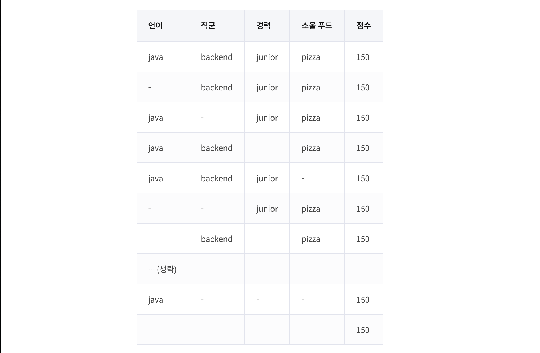 java backend junior pizza 150에 해당하는 지원자가 있다고 하면, 이 지원자는 다음과 같은 16가지의 그룹으로 나눌 수 있다.