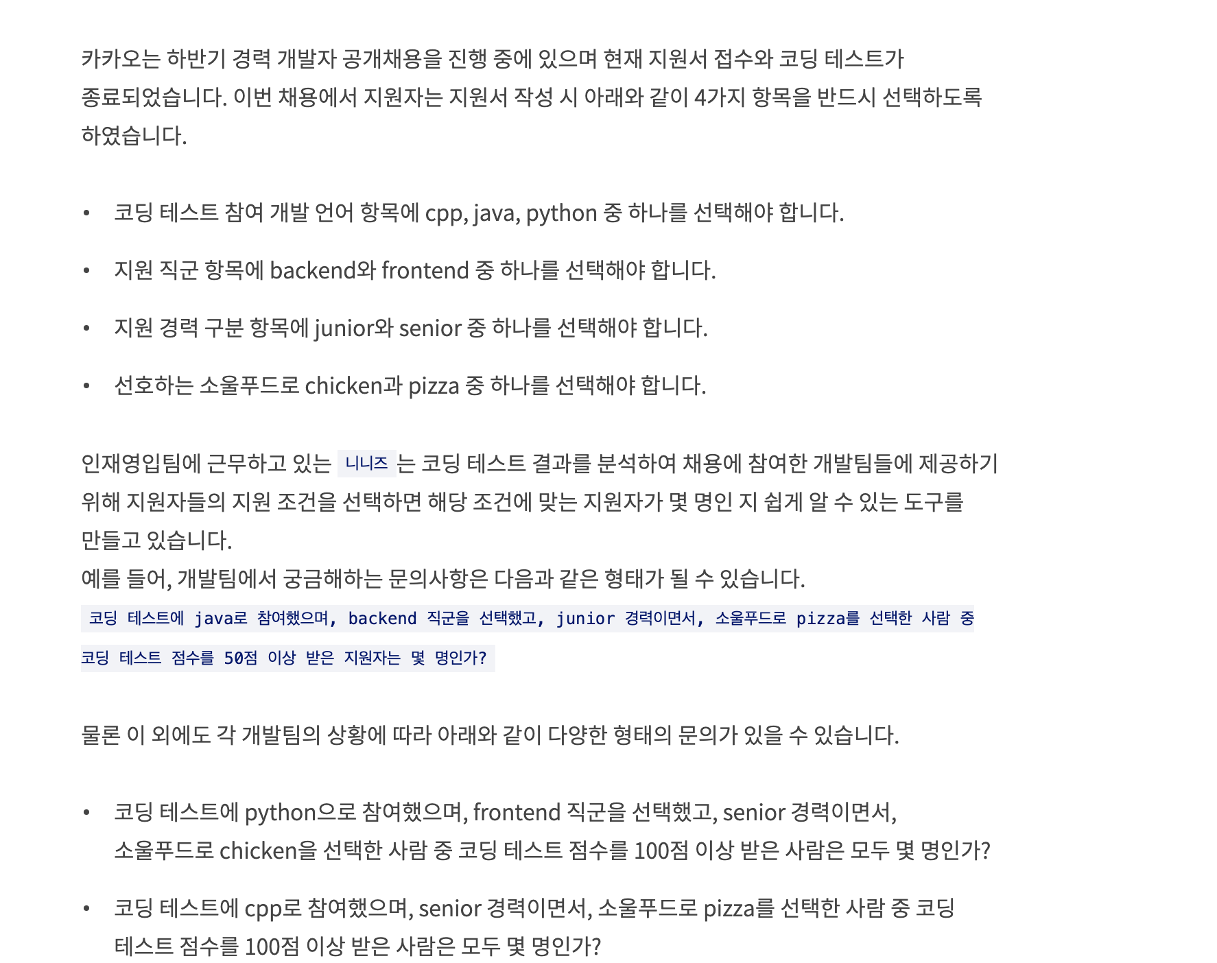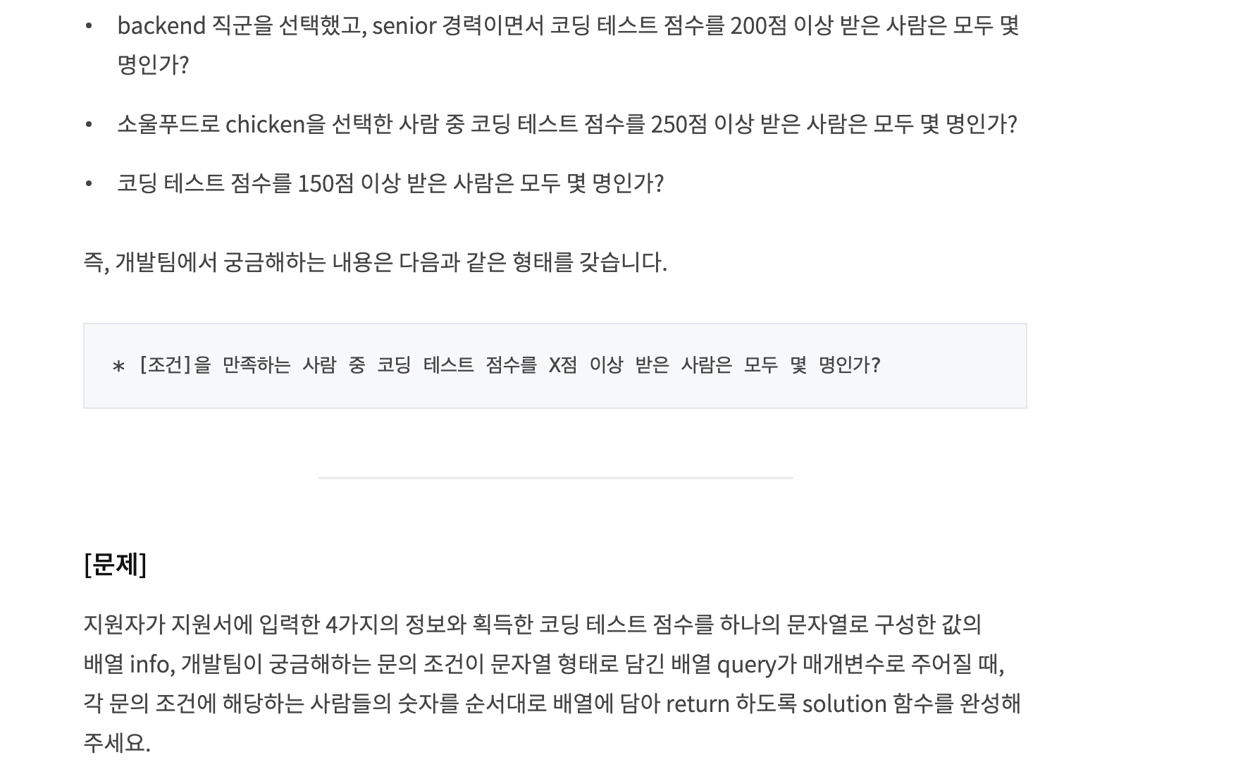 그렇다면 이러한 그룹을 어떻게 나눌 것인가. 지원자의 정보를 공백을 기준으로 나누고, 나눈 정보들의 조합을 하나의 키로 사용한다. 이때 value는 코딩테스트 점수가 될 것이다. 그리고 query를 확인하기 전에 value값들을 정렬해준다.