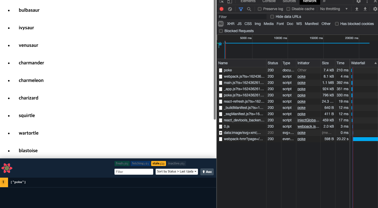 옆의 개발자 도구에서 네트워크 창을 보면 데이터 요청없이 SSR로 포켓몬 이름을 잘 출력하는 것을 볼 수 있다.