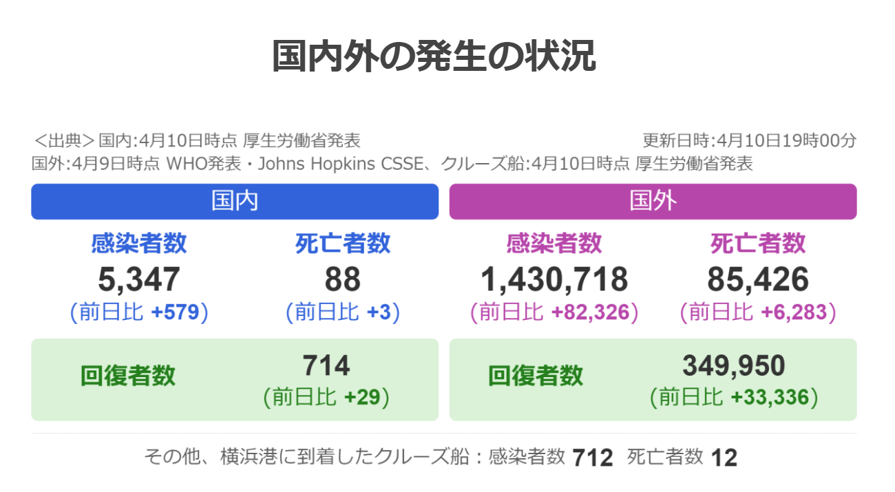 국외 : 4월9일 기준 WHO발표 / Johns Hopkins CSSE / 크루즈선 : 4월10일 기준 후생노동성발표