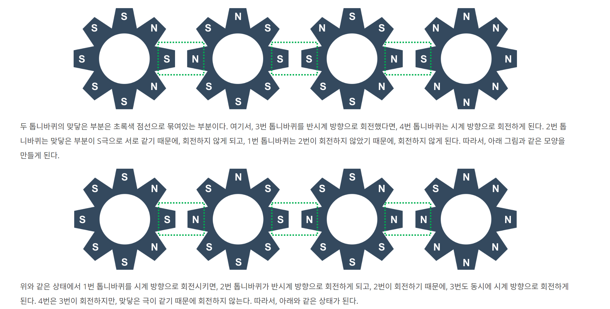 left 함수와 right 함수에 각각 num부터 첫 번째 톱니바퀴 까지, num부터 마지막 톱니바퀴 까지 회전 방향과 함께 매개변수로 주면서 검사한다. 모든 톱니바퀴에 대한 검사가 끝나면 result 배열을 돌면서 turn 함수를 통해 회전시킨다.