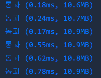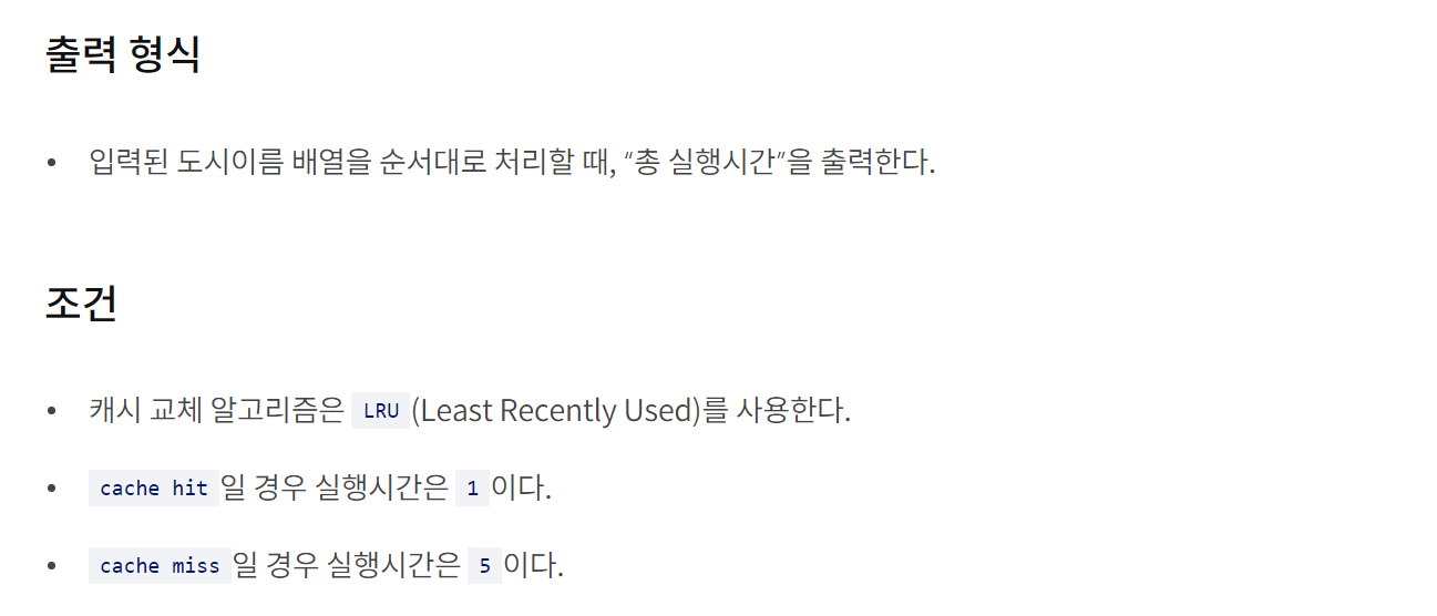 - 캐시 크기가 클 경우 캐시에서 가장 오래된 값(인덱스 : 0)을 제거하고 현재 도시를 넣어준다. 그리고 실행시간에 5를 더해준다.