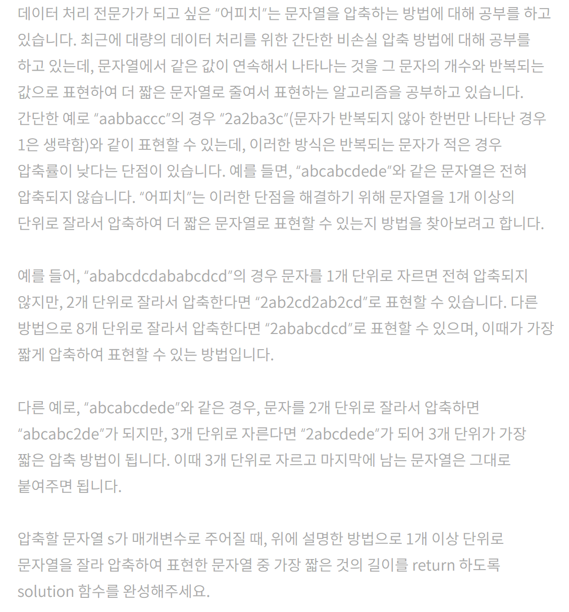 압축하는 문자열의 길이가 1부터 N(문자열의 길이)//2 까지의 경우를 다 찾고, 이 값들 중에 가장 작은 값을 리턴한다.