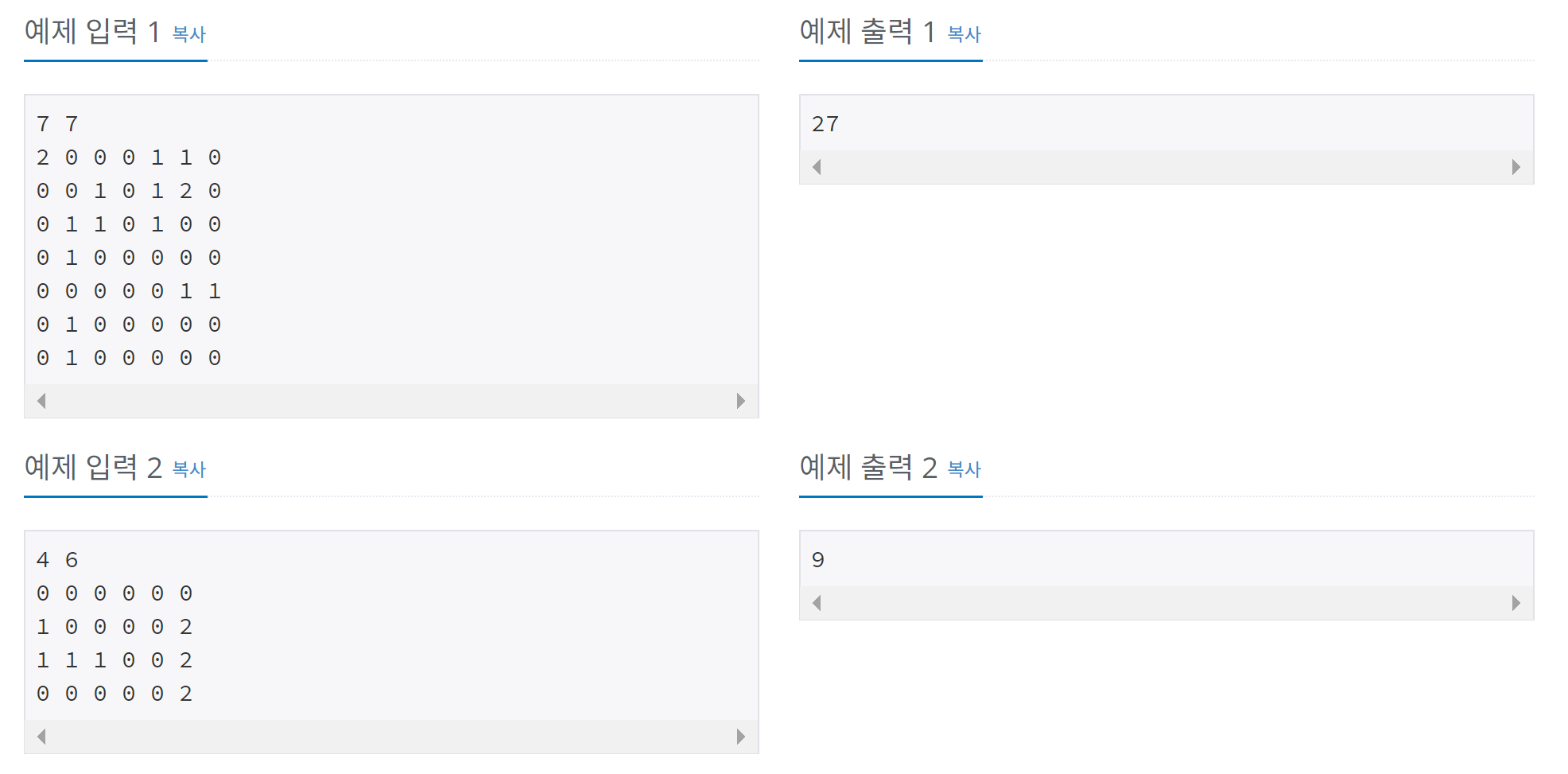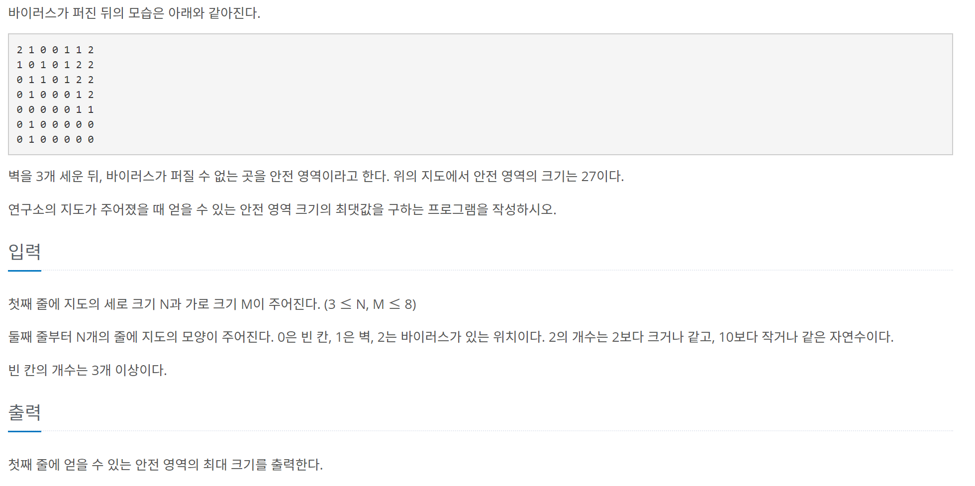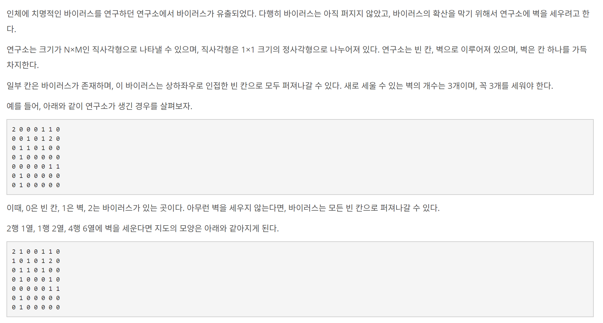 인체에 치명적인 바이러스를 연구하던 연구소에서 바이러스가 유출되었다. 다행히 바이러스는 아직 퍼지지 않았고, 바이러스의 확산을 막기 위해서 연구소에 벽을 세우려고 한다. 연구소는 크기가 N×M인 직사각형으로 나타낼 수 있으며, 직사각형은 1×1 크기의 정사각형으로 나누어져 있다. 연구소는 빈 칸, 벽으로 이루어져 있으며, 벽은 칸 하나를 가득 차지한다. 일부 칸은 바이러스가 존재하며, 이 바이러스는 상하좌우로 인접한 빈 칸으로 모두 퍼져나갈 수 있다.