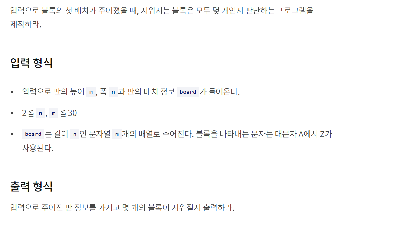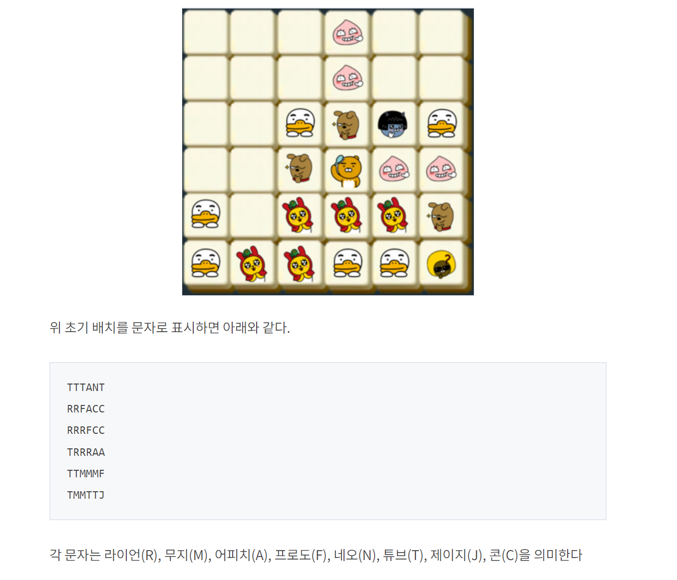 블록을 나타내는 문자는 대문자 A-Z로, 라이언(R) / 무지(M) / 어피치(A) 등 문제에서 설명한 캐릭터들만 있는게 아니다. 즉 A부터 Z까지 각 문자가 나타내는 캐릭터가 있다고 생각하면 된다.