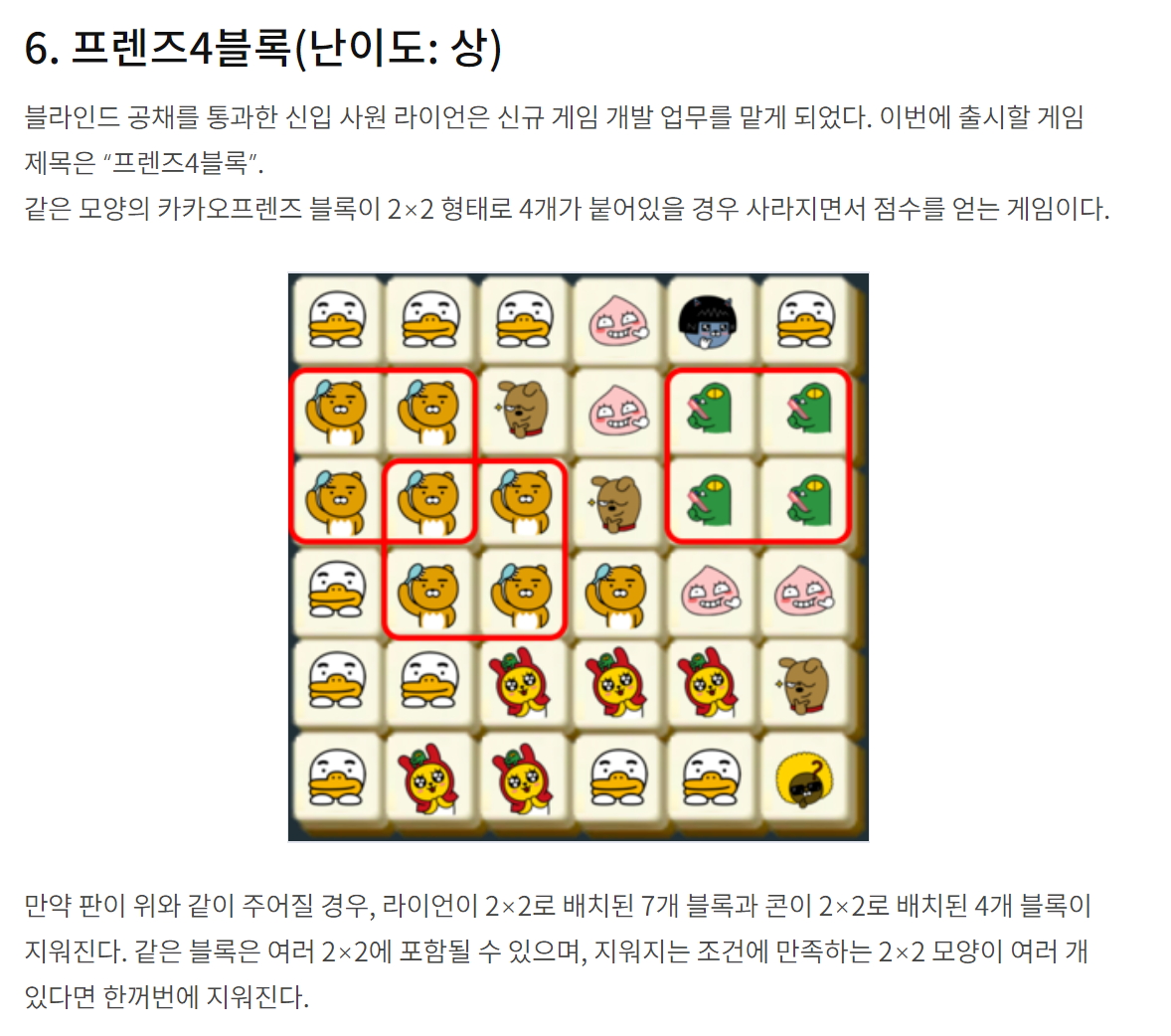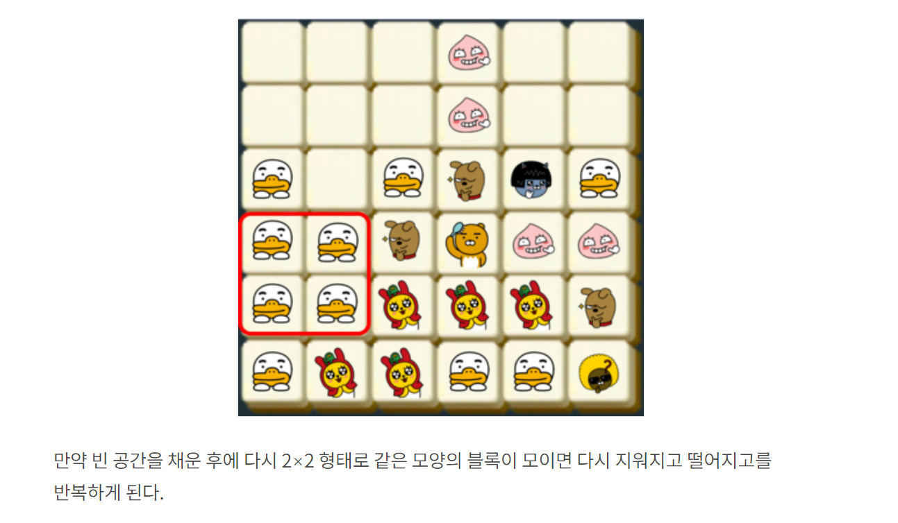 - 카카오 프렌즈 블록에서 2X2 형태로 붙어있는 블록(제거할 블록)들을 찾는다.