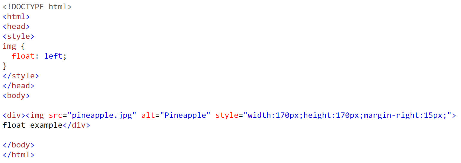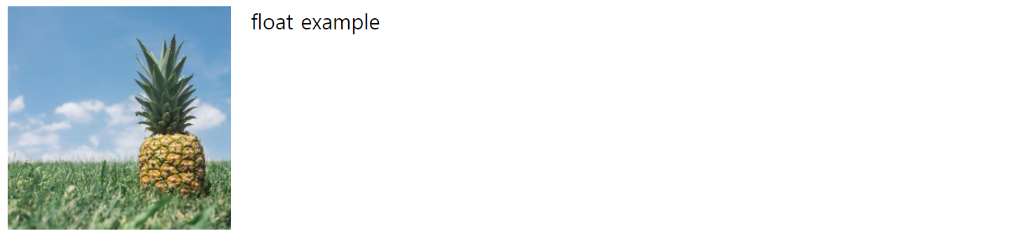 div 내에서 img 태그를 이용해 파인애플 사진을 넣고, float 속성에 left 값을 부여했다. 그러면 div 컨테이너 내에서 왼쪽에 위치하게 된다. right 값을 주면 오른쪽에, none 값(default)을 주면 평소대로 정렬되지 않고 예쁘지 않게 나온다. inherit은 부모의 float 값을 따른다.