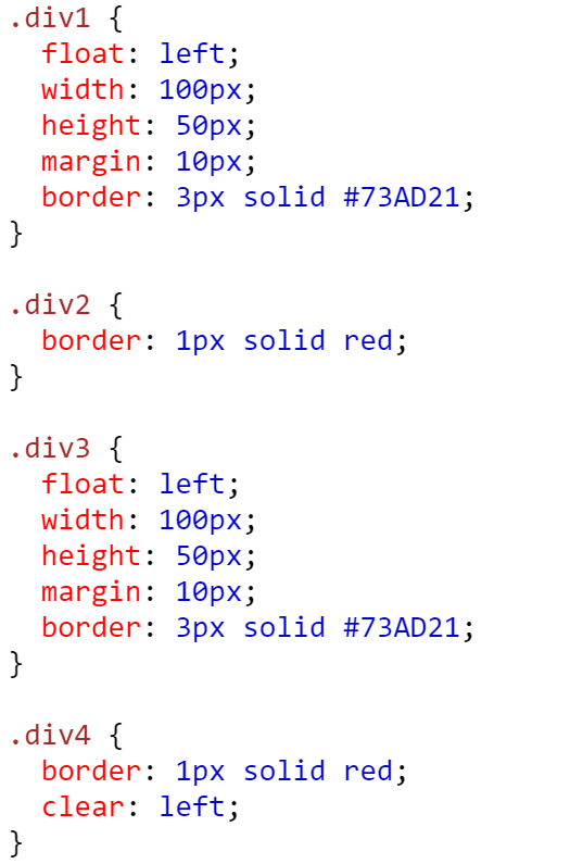clear 속성은 쉽게 말해, 해당 값에 대한 위치에 아무런 요소가 없게끔 해주는 것이다. 보통 clear 속성은 어떤 요소에 float 속성을 사용하고난 뒤에 사용한다. 만약 내가 <div> 값에 float: left; 를 줬으면, 다음 <div> 에서 clear: left; 를 해주어야 컨테이너들이 겹치지 않게 나온다. 값은 left, right, both, none, inherit 등이 있다.