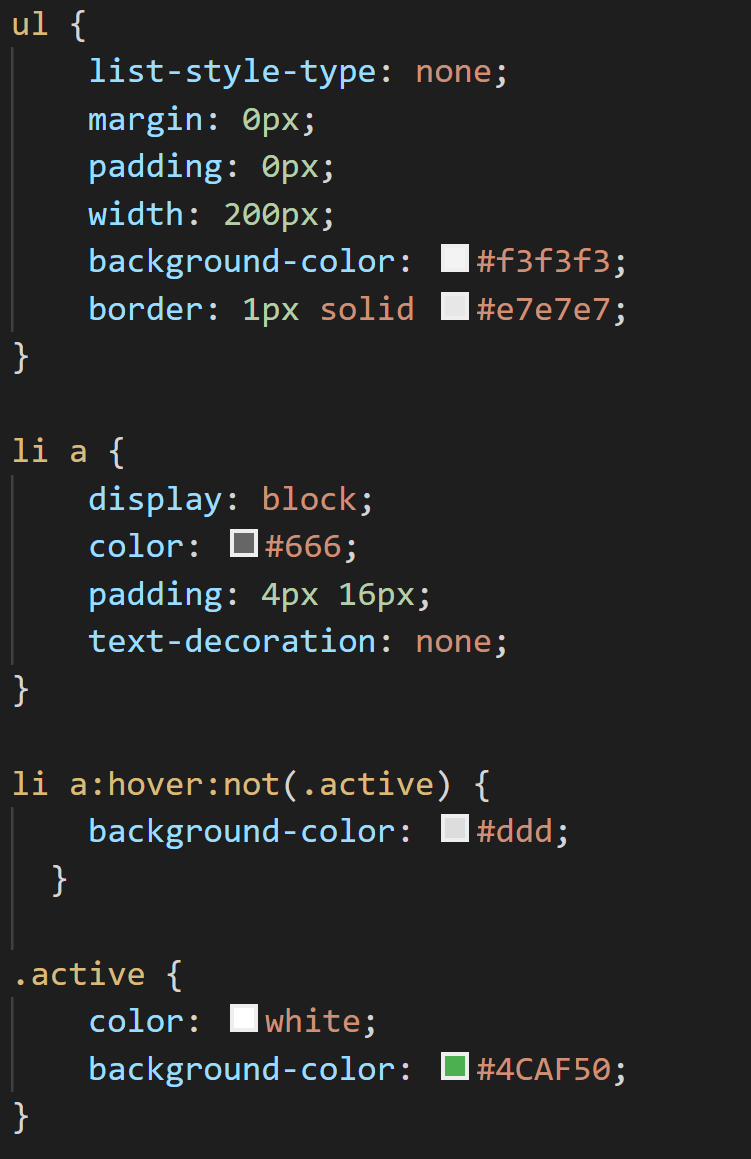 밑에 있는 코드는 차례대로 active가 아닌 a태그에 마우스가 올라오면 배경색을 바꾸는 것이고 active 클래스에서는 코드대로 글자색과 배경색을 지정한다.