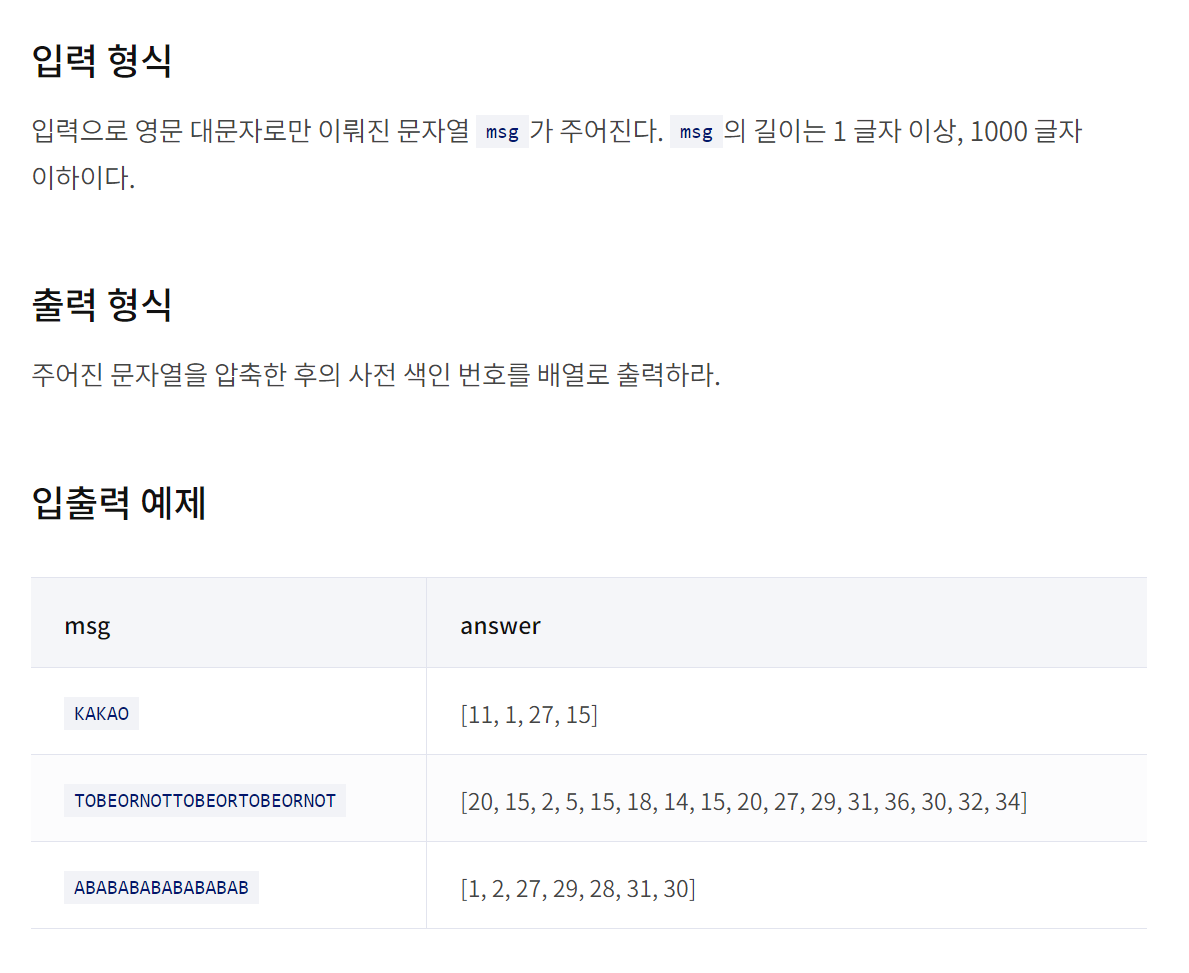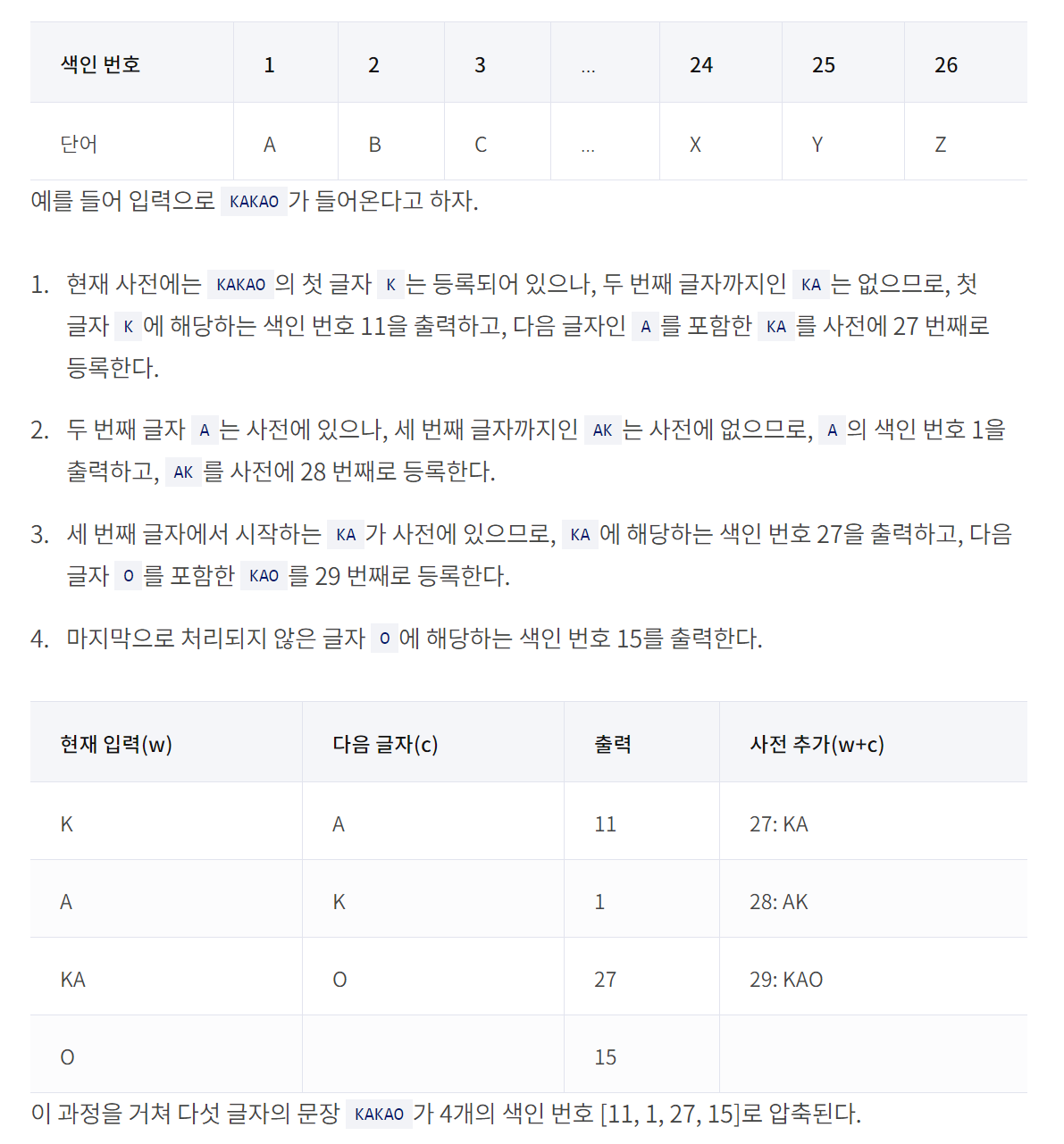 문제에 나와있는 LZW 압축 알고리즘 설명을 그대로 구현하면 되는 문제였다.