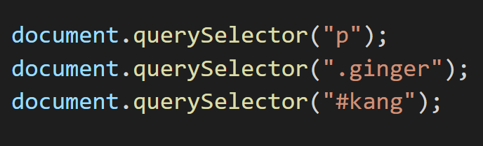 위와 같이 쓸 수 있다. 매개변수로 "p" 를 줬을 때는, HTML에서 <p>태그를 가진 요소들 중에 가장 첫 번째 노드를 리턴한다. 클래스 이름을 통해 찾고 싶을 때는 ".ginger" 와 같이 . 을 붙여준다. id를 통해 찾을 때는 # 을 붙여준다.