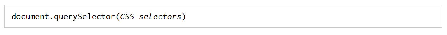 document.querySelector() 는 입력한 선택자와 일치하는 문서 내의 첫 번째 element를 반환한다. 일치하는 요소가 없다면 null을 반환한다. 괄호 안에 들어가는 매개변수는 유효한 CSS 선택자여야한다.