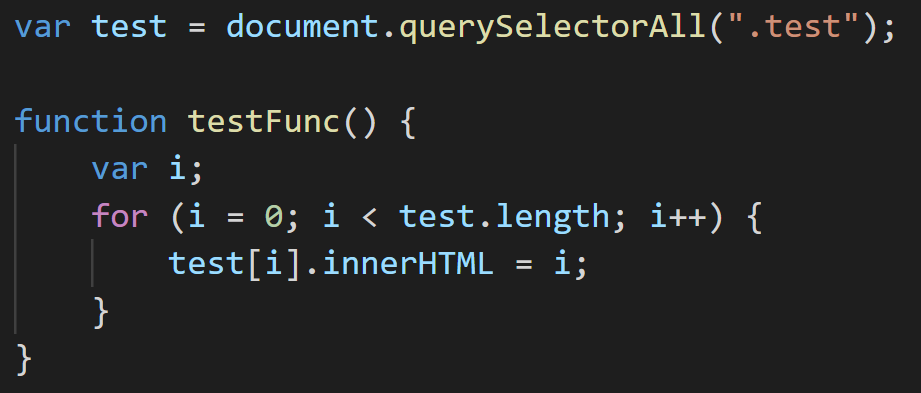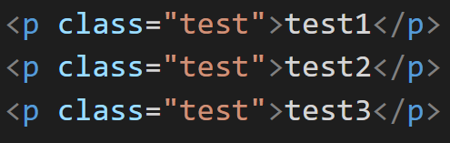 test를 가진 <p> 태그가 3개 있다. JavaScript에서 querySelectorAll(".test")를 통해 3개의 요소를 test 변수에 저장한다. 그럼 test변수는 마치 다른 언어의 배열과 같은(하지만 배열과는 다르다.) 역할을 한다. test[i]와 같이 인덱스를 통해 원하는 요소에 접근할 수 있고 length라는 속성도 제공되고 있다.