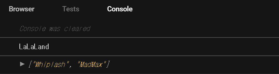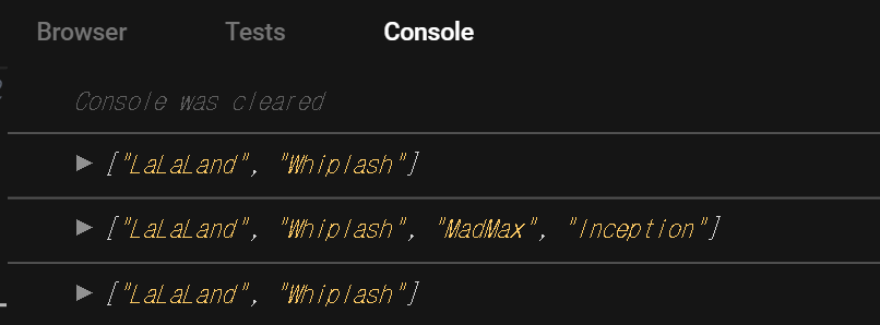 이렇게 myMovies 배열을 선언할 때, 배열 내에서 ...damienMovies 와 같이 작성해주면 이 것은 damienMovies 배열의 값들을 가져다 쓴다는 의미이다. 여기서 핵심은 spread 문법을 통해 다른 배열을 선언해주어도 기존의 배열(damienMovies) 값에는 영향을 끼치지 않는다는 점이다. myMovies를 선언하기 전과 후의 damienMovies의 값을 출력한 결과를 보자.
