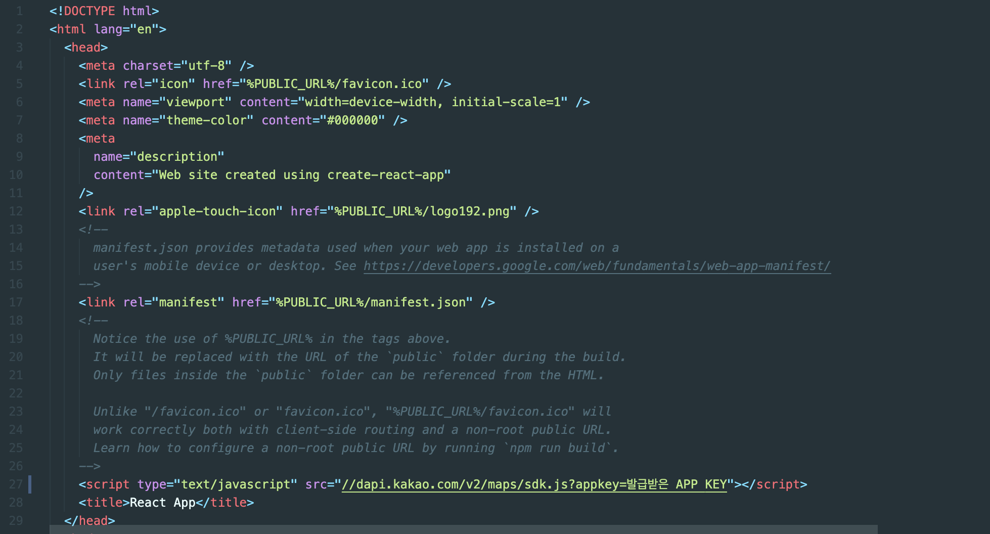 <script type="text/javascript" src="//dapi.kakao.com/v2/maps/sdk.js?appkey=발급받은 APP KEY"></script>