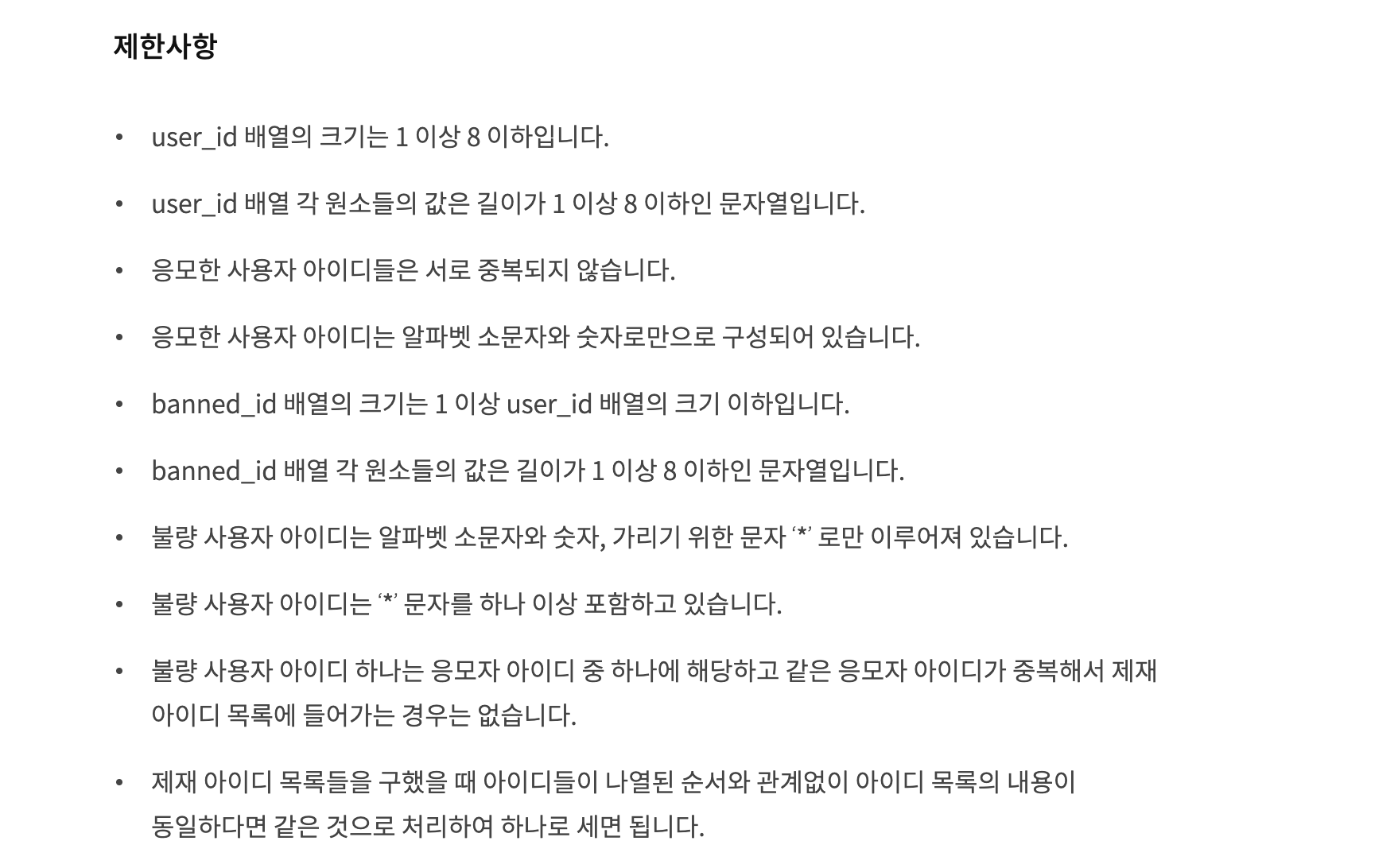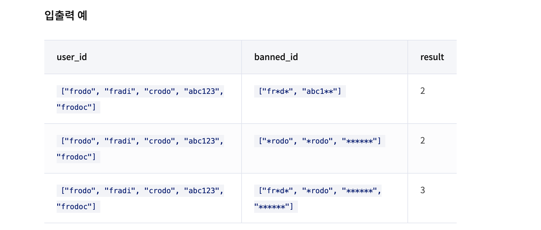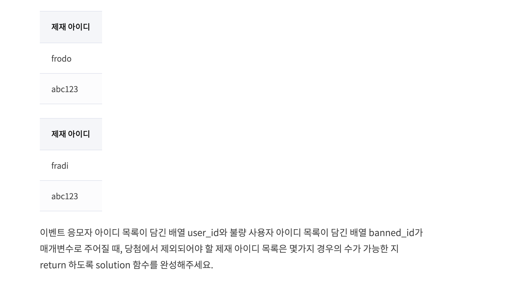 user_id의 크기도 8 이하 이므로 나올 수 있는 모든 경우의 수를 구하고, 경우의 수 하나씩 검사한다. 문제에서 제재 아이디 목록의 순서가 없다고 했으므로, 모든 경우의 수를 처음에는 itertools의 combinations를 써서 구했는데 테스트 케이스 3에서 예외가 생겼다. 이유는 내 풀이대로 하면 한 경우의 수의 id와 banned_id의 id를 인덱스로 앞에서부터 비교를 하기 때문이였다. 이렇게 비교를 하다보니 순서가 엉켜버린 것이다. 즉 순서가 없는 경우를 구하는 것이지만 순서가 있는 경우의 수를 통해 결과 도출을 해야한다. 그래서 permutations로 모든 경우의 수cb_user_id를 구했다. 하나씩 비교를 한 후 아닌 경우는 무시하고, 맞다면 튜플인 cb를 리스트로 바꾸고 정렬해서 result 배열에 넣어준다. 이때 result 배열의 길이는 정답의 2배수가 나올 것이다. 정렬을 해서 넣었기 때문에 겹치는 것을 필터링한 후 나온 길이를 리턴한다.