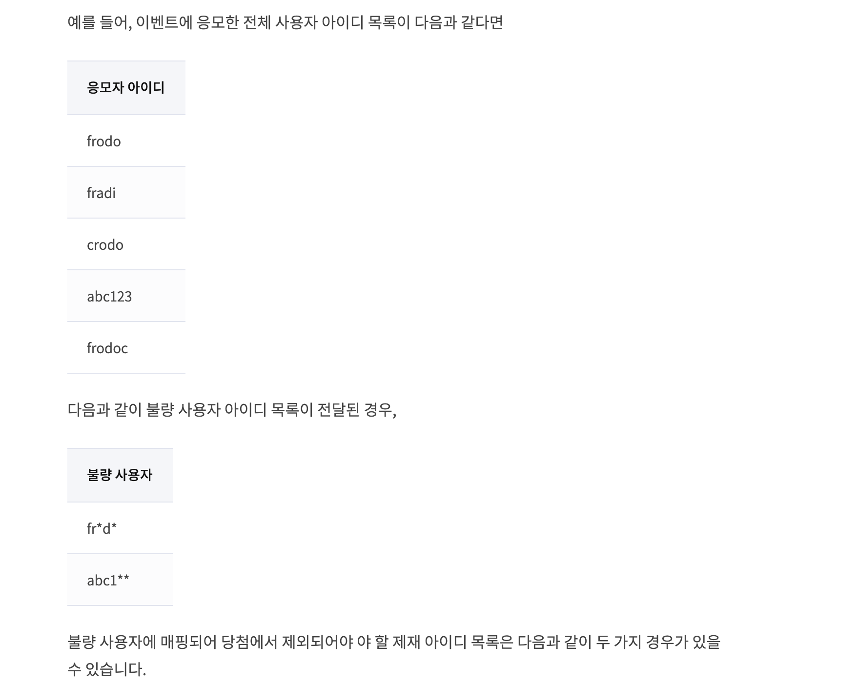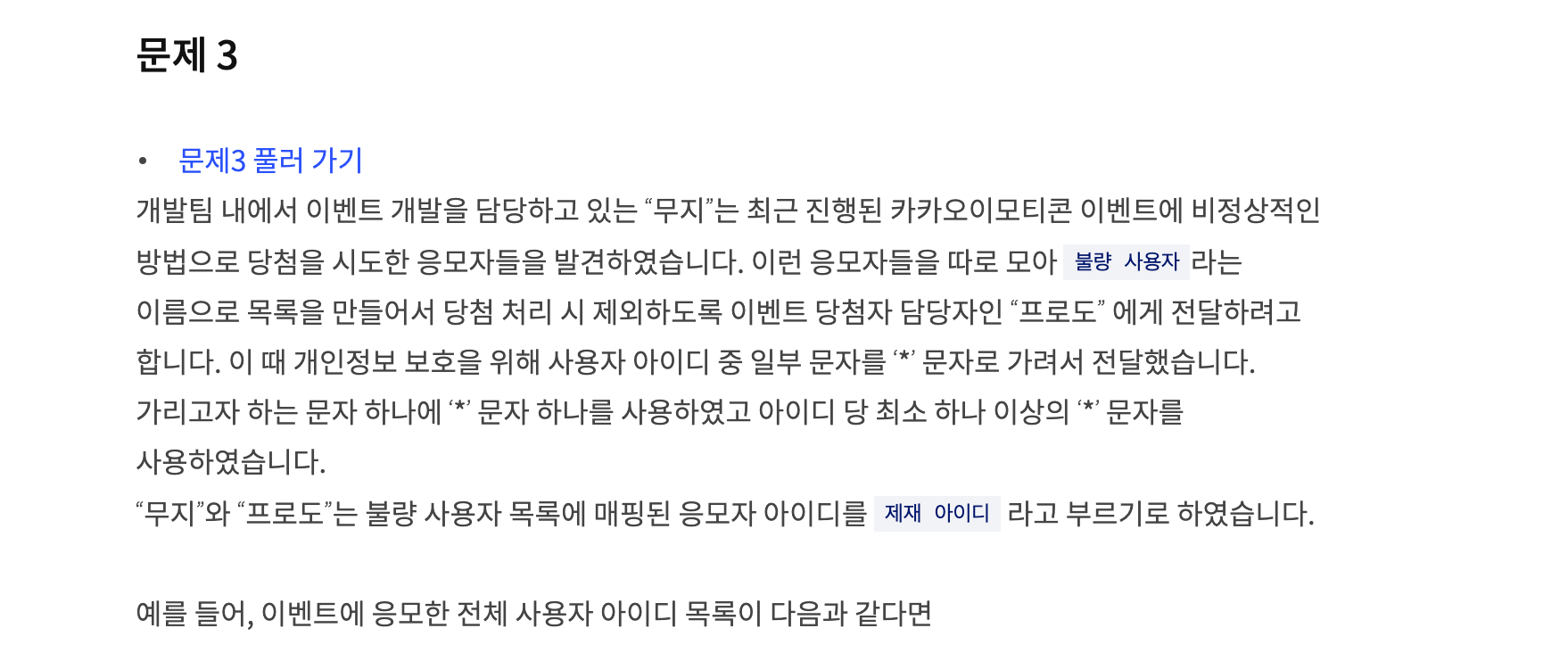 개발팀 내에서 이벤트 개발을 담당하고 있는 무지는 최근 진행된 카카오이모티콘 이벤트에 비정상적인 방법으로 당첨을 시도한 응모자들을 발견하였습니다. 이런 응모자들을 따로 모아 불량 ��