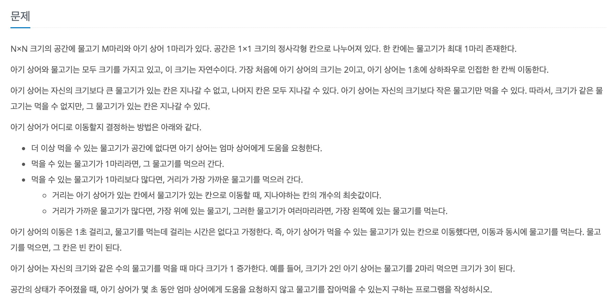 N×N 크기의 공간에 물고기 M마리와 아기 상어 1마리가 있다. 공간은 1×1 크기의 정사각형 칸으로 나누어져 있다. 한 칸에는 물고기가 최대 1마리 존재한다. 아기 상어와 물고기는 모두 크기를 가��