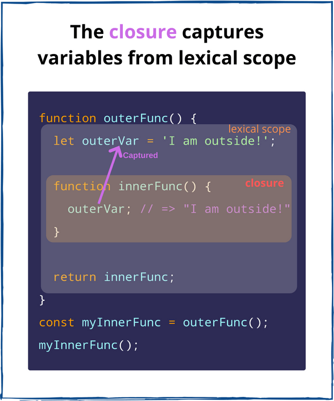 위의 그림과 같이 innerFunc이 클로저를 생성하며 outerVar을 캡쳐해 놓는다고 생각을 하면 된다.