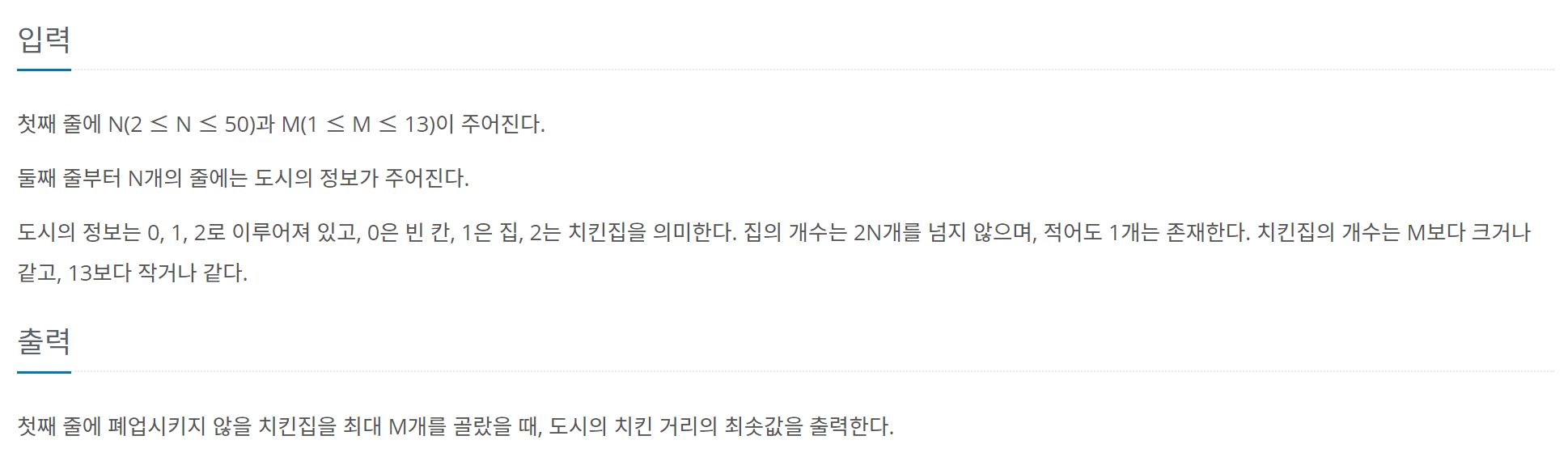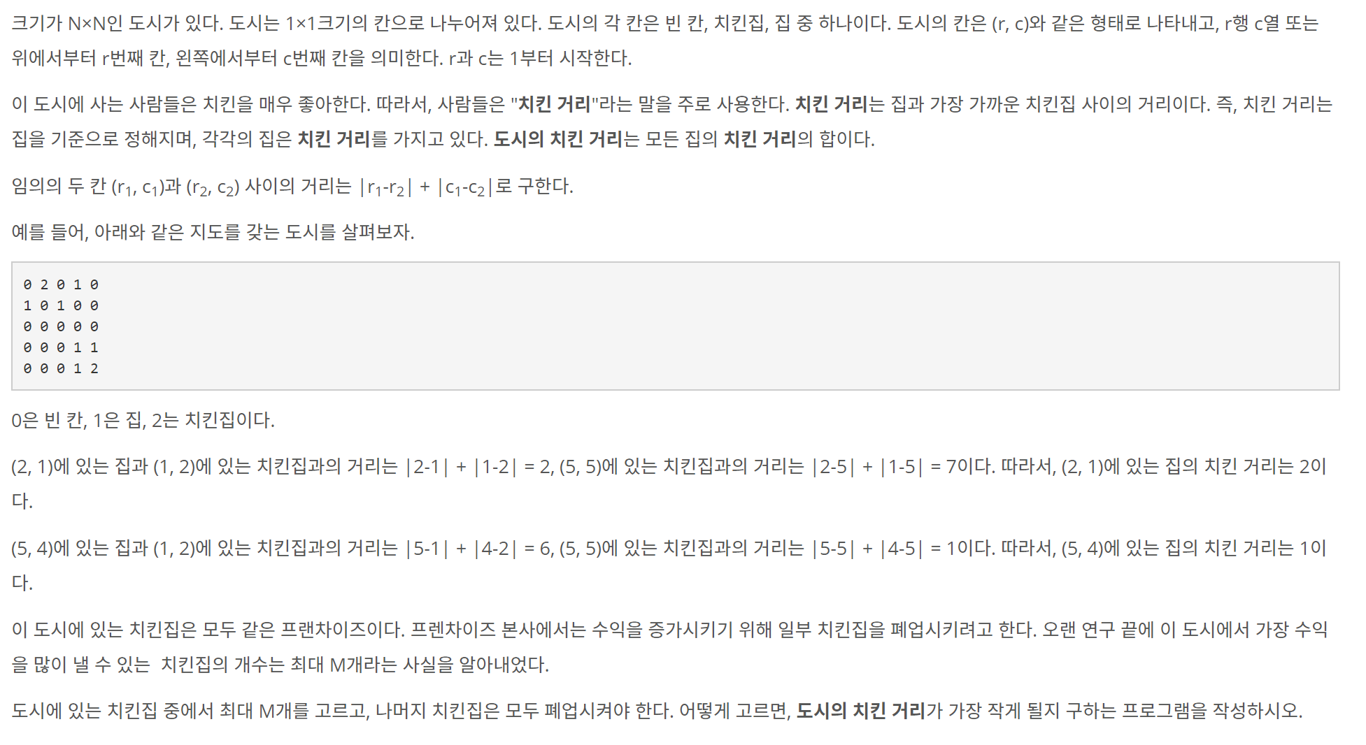 크기가 N×N인 도시가 있다. 도시는 1×1크기의 칸으로 나누어져 있다. 도시의 각 칸은 빈 칸, 치킨집, 집 중 하나이다. 도시의 칸은 (r, c)와 같은 형태로 나타내고, r행 c열 또는 위에서부터 r번째 칸, 왼쪽에서부터 c번째 칸을 의미한다. r과 c는 1부터 시작한다. 이 도시에 사는 사람들은 치킨을 매우 좋아한다. 따라서, 사람들은 "치킨 거리"라는 말을 주로 사용한다. 치킨 거리는 집과 가장 가까운 치킨집 사이의 거리이다. 즉, 치킨 거리는