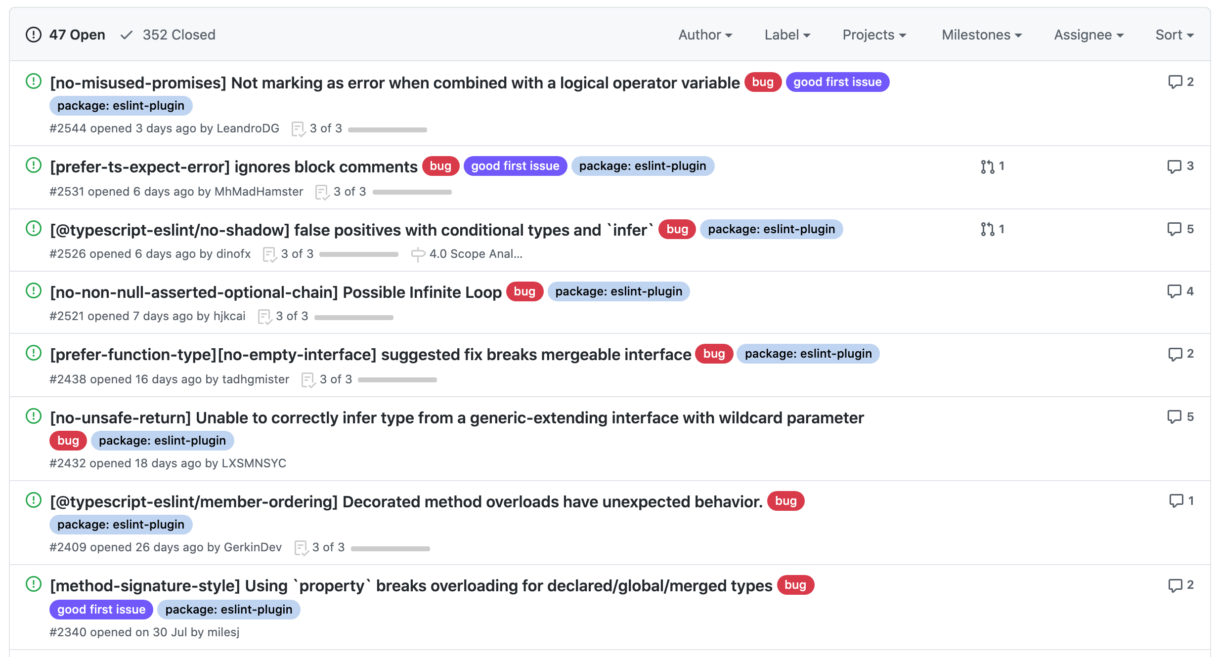 컨트리뷰톤이 시작되고 이슈를 선정해야했다. 처음이라 버그 이슈 위주로 살펴보았는데 EsLint는 이슈가 많이 없고 있어도 이미 PR이 올라온 것이 많아 당장은 기여하기 힘들 것 같았다. 그래서 EsLint의 플러그인 중 하나인 typescript-eslint의 이슈들을 살펴보기 시작했다. EsLint는 확장성이 높아 다양한 플러그인을 제공하는데 그 중 하나가 TypeScript에 대한 정적 분석을 지원하는 typescript-eslint이다.