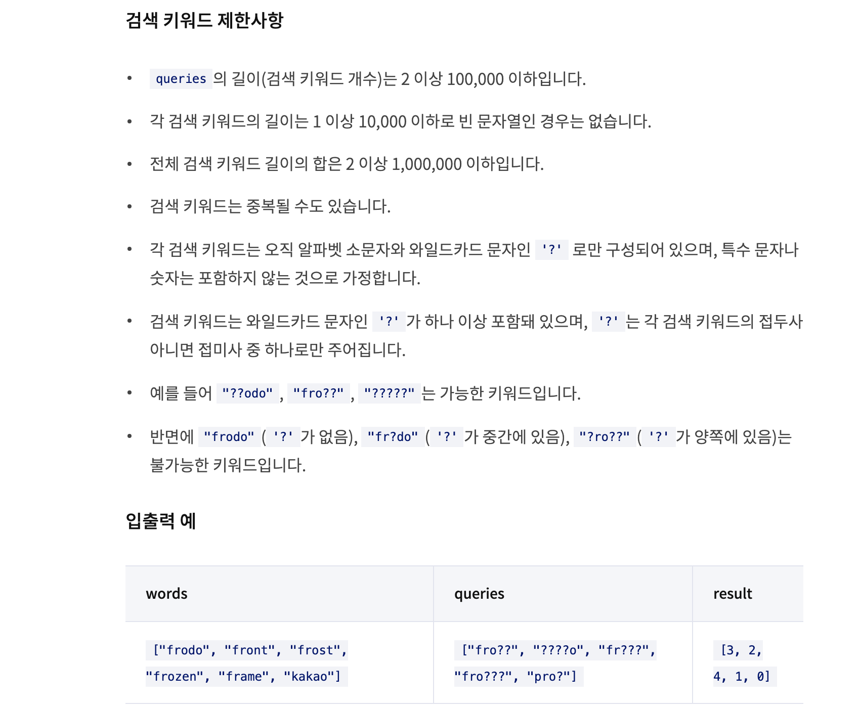 물음표가 앞에서부터 있을 수 있고, 뒤에서부터 있을 수 있기 때문에 Trie를 순방향과 역방향 두 개 만들어준다. 그리고 queries를 확인하며 물음표가 뒤에 있는 경우 물음표의 인덱스를 찾아 물음표의 개수(wild)와 물음표를 뺀 문자열(query)를 선언한다. 물음표부터 앞에 있는 경우의 query는 query를 뒤집고 똑같은 로직으로 wild와 query를 선언한다. 그 후 search메서드에 인자로 넘겨준다.